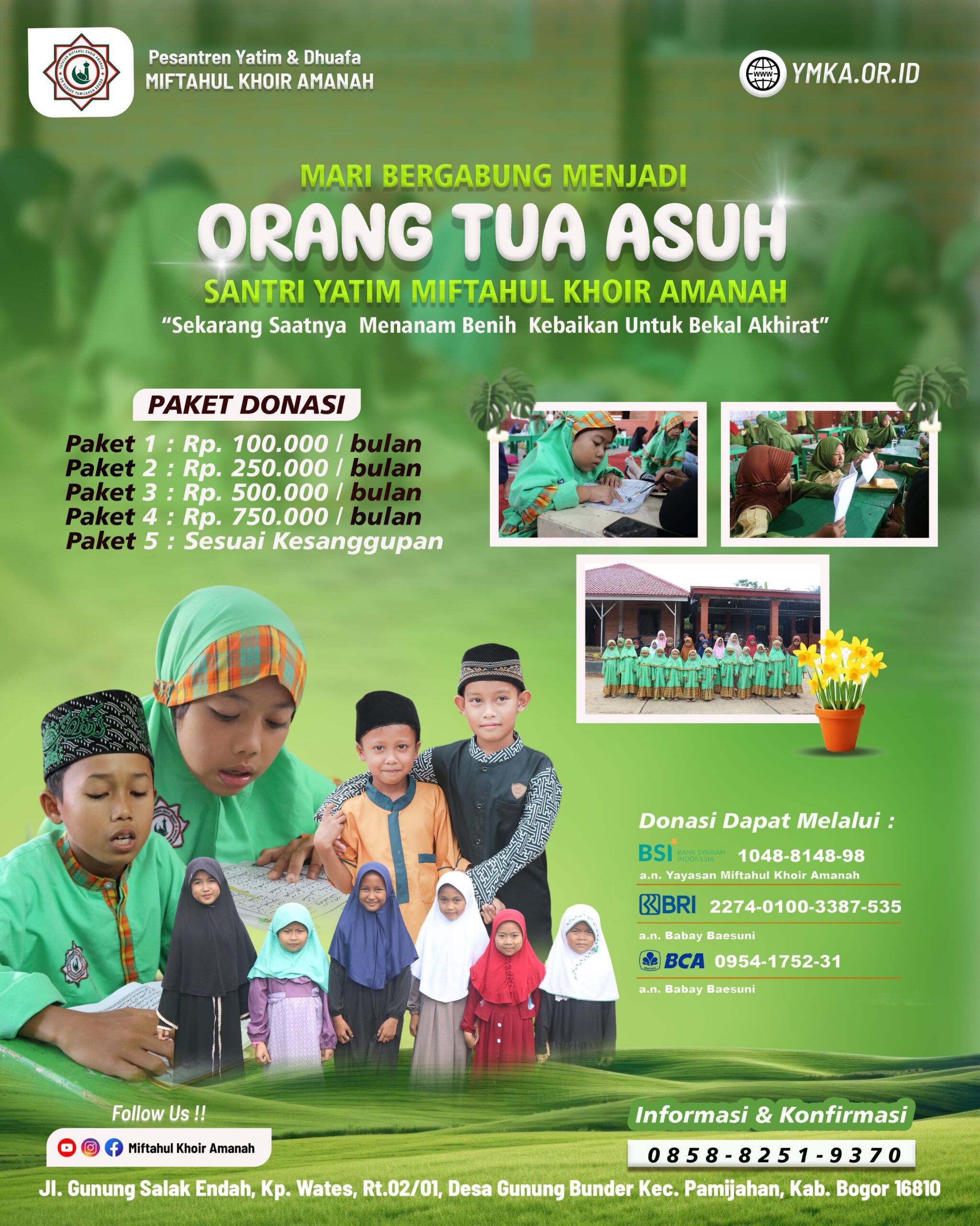 Yayasan Miftahul Khoir Amanah adalah Yayasan yang bergerak dibidang sosial kemanusiaan dengan menyalurkan bantuan berupa donasi untuk Santunan Anak Yatim dan Dhuafa.